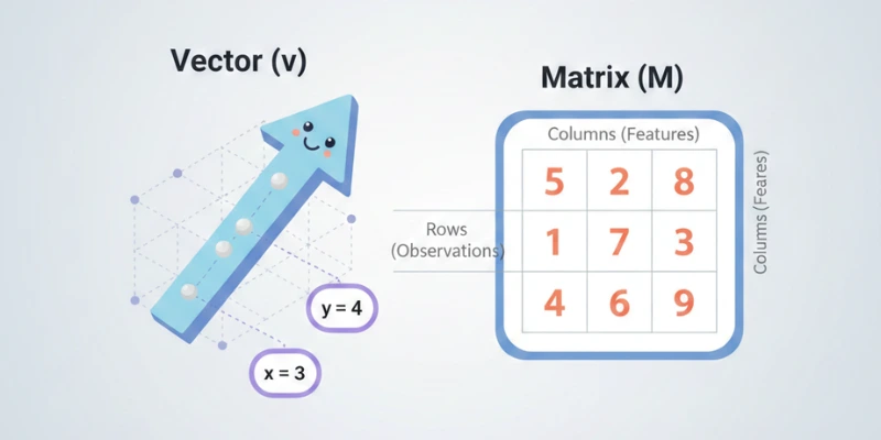 Vectors also have direction and size when viewed geometrically. This idea helps explain why vectors are useful for representing movement, change, or position. In data analysis, this translates to how features vary together. Thinking of a vector as a single row or column of meaningful values improves clarity.